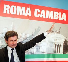 | Il sindaco Alemanno mentre saluta la pioggia |